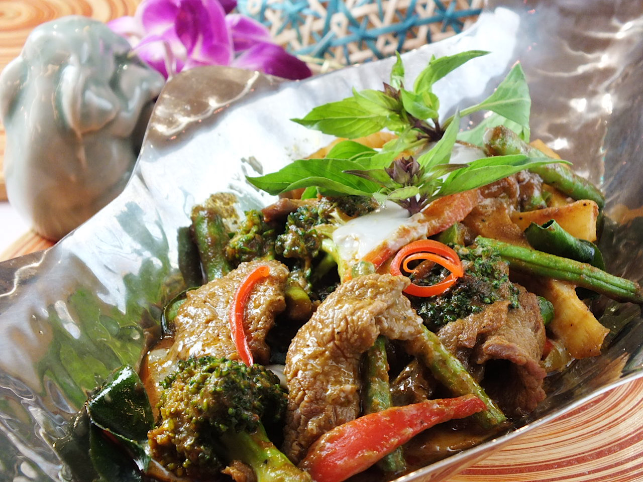 ผัดกับผักตามฤดูกาลโดยใช้เครื่องแกงเขียวหวานที่เป็นยอดนิยมในประเทศไทย และเนื้อวัวดำที่ดีที่สุดของประเทศญี่ปุ่น เครื่องเทศของพริกเขียว สมุนไพร และกลิ่นหอมหวานของกะทิจะช่วยดึงรสชาติของเนื้อวัวออกมาให้ได้ลิ้มรส