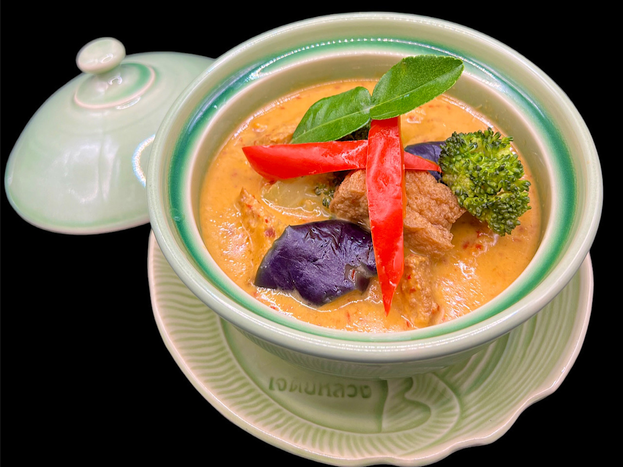เราใช้ส่วนผสมที่หลากหลาย เช่น เต้าหู้ ถั่วฝักยาว ถั่วลิสง และเครื่องเทศ แกงเผ็ดแบบไทยแท้สูตรเฉพาะสำหรับผู้เป็นมังสวิรัติและวีแกน ไม่มีส่วนผสมของเนื้อสัตว์