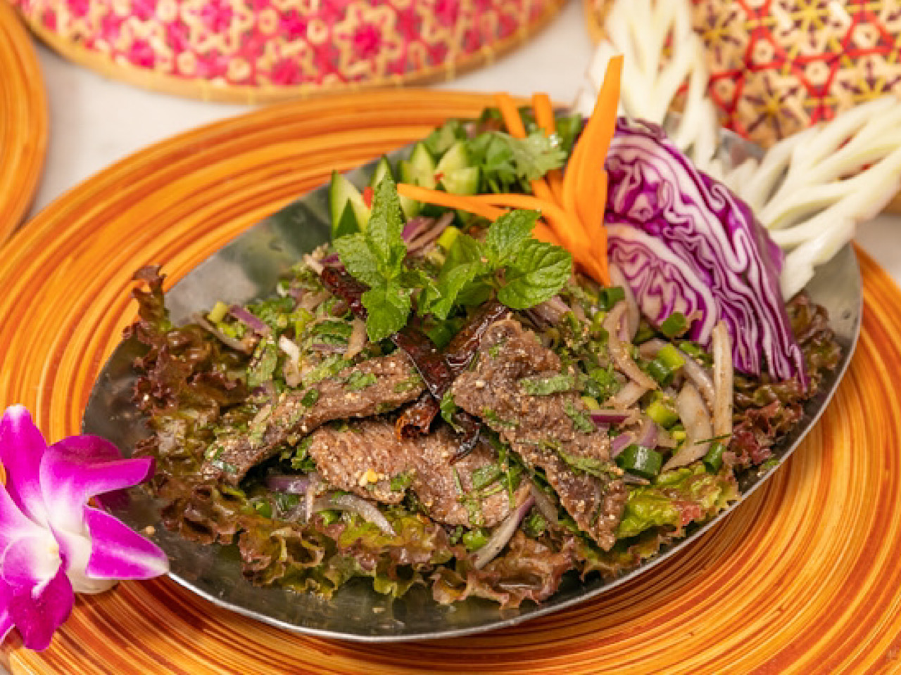 อาหารท้องถิ่นจากภาคอีสานของประเทศไทย ปรุงด้วยเนื้อวัวดำที่ดีที่สุดของประเทศญี่ปุ่น ใช้ข้าวคั่ว พริกป่น สมุนไพร และเครื่องปรุงรสแบบไทย ความเปรี้ยวและความเผ็ดที่สดชื่นจะช่วยดึงเสน่ห์ของอาหารและรสชาติของเนื้อวัวออกมาให้ได้ลิ้มรส