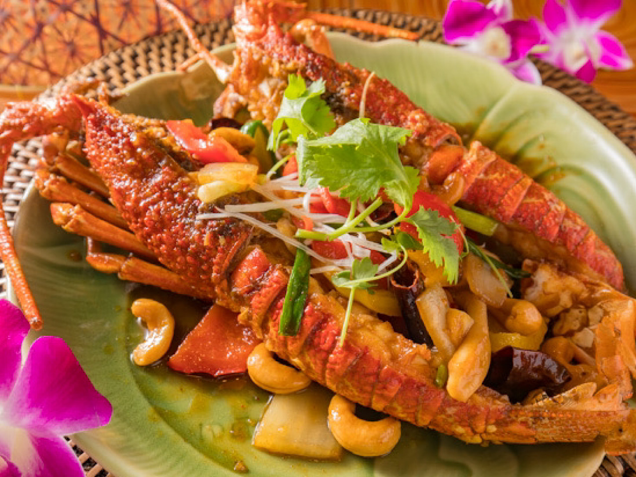 กุ้งล็อบสเตอร์ตัวใหญ่ผัดด้วยซอสหอยนางรมคุณภาพสูงและซีอิ๊วไทย พร้อมกับเม็ดมะม่วงหิมพานต์ที่มีกลิ่นหอม และผักตามฤดูกาล