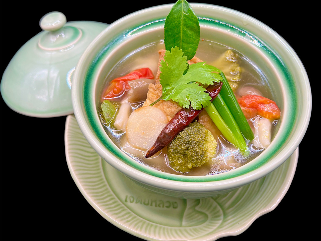 ประกอบด้วยเต้าหู้ และผัก เช่น เห็ดและมะเขือเทศ ต้มยำรสเผ็ดพร้อมผักรสเปรี้ยวสำหรับผู้ที่เป็นมังสวิรัติและวีแกน ไม่มีส่วนผสมของเนื้อสัตว์