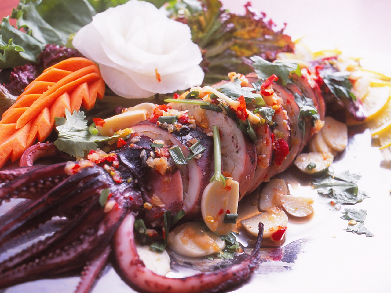 ปลาหมึกสดทั้งตัวยัดไส้ด้วยหมู วุ้นเส้น รากผักชี และอื่นๆอย่างพิถีพิถัน แล้วนำไปนึ่ง รับประทานกับน้ำจิ้มสูตรพิเศษที่ทำจากพริกแดง มะนาว สมุนไพร และน้ำปลา